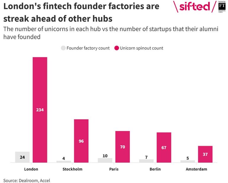 Ha régiók szerint nézzük, London mint európai fintech hub egyértelműen kiemelkedik: az összesen 24 darab fintech unikornisa 234 darab másodgenerációs startupot termelt ki magából az elmúlt évben. Azaz egyetlen londoni fintech unikornisra átlagosan közel 10 darab újonnan alapított startup jut. A második helyen Stockholm áll 4 darab unikornissal és 96 darab új startuppal (24 startup / unikornis), a harmadik pedig Párizs lett 10 darab unikornissal és 70 darab új startuppal (7 startup / unikornis).