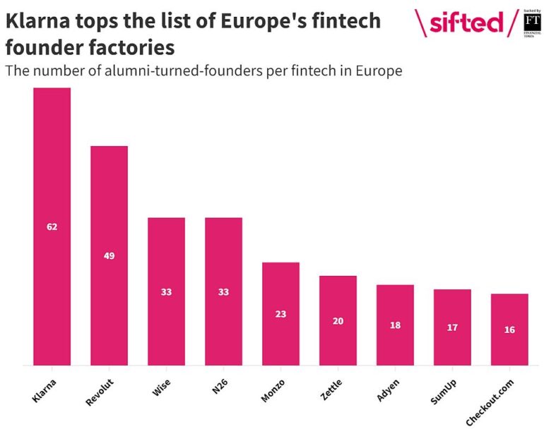 62. Összesen ennyi darab startupot hoztak létre a svéd fintech unikornis, a Klarna korábbi alkalmazottai 2024-ben. Ezzel a Klarna megelőzte a 2023-ban ezen a területen első brit Revolutot, ami idén „csak” 49 másodgenerációs startup alapításában játszott szerepet – ezt mutatta ki a rangos londoni VC, az Accel és a Dealroom idei közös kutatása. Ebben egész pontosan azt vizsgálták, hogy a kockázati tőkével támogatott, európai és izraeli fintech unikornisoknál legalább öt hónapig, teljes munkaidőben dolgozó volt kollegák mennyi új startup alapításában vettek részt 2024-ben. A BNPL (buy now, pay later, azaz vásárolj most, fizess később) svéd unkornis környezetében született új startupok száma ezzel a tavalyi adat (32 darab) közel duplájára emelkedett, de a második helyre szorult Revolut sem panaszkodhat: 2023-ról (34 darab startup) 2024-re (49 darab startup) 44 százalékkal növekedett a korábbi alkalmazottak által alapított startupok száma. Idén a megosztott harmadik helyre a pénzügyi transzferszolgáltatást nyújtó, észt Wise, valamint a német neobank, az N26 került fel 33-33 újonnan alapított startuppal.