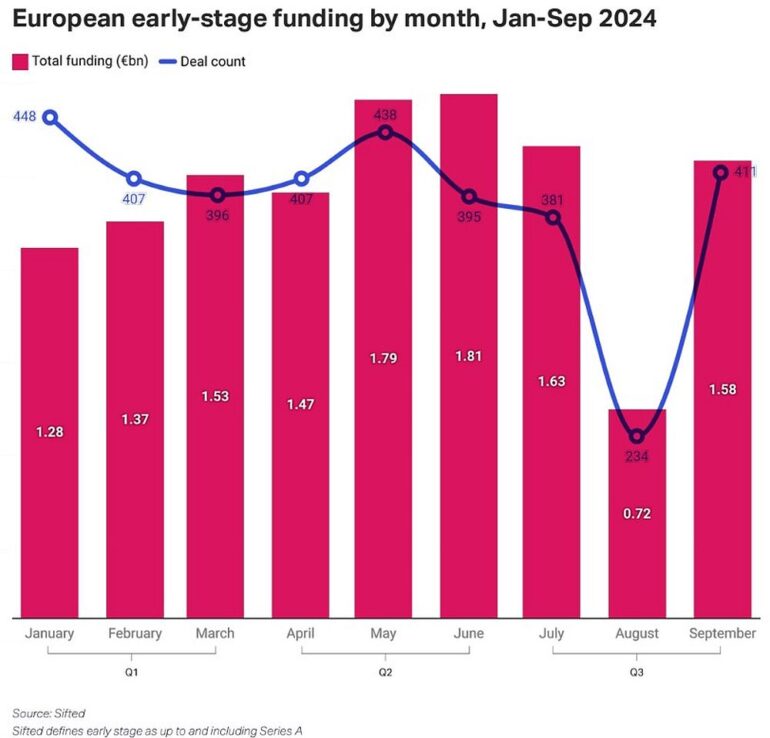 Ami egyértelműen lehúzza a számokat, az az augusztus, ami önmagában nem lenne meglepő: ekkor megy el ugyanis hagyományosan nyári szabadságra az európai ökoszisztéma. Augusztus minden tekintetben rosszabbul teljesített, mint 2024 többi hónapjának átlaga: a dealek számába, értékében, a különböző szakaszú és típusú befektetések értékében, a legnagyobb és az átlagos befektetési értékben, valamint a VC-k által lebonyolított felvásárlások számában is. Ami a meglepő: ellentétben például a tavalyi Q3-as helyzettel, az augusztus képes volt bedönteni a teljes negyedéves statisztikát, amit nem volt képes ellensúlyozni az erősebb július és szeptember. Jonathan Sinclair, a Sifted kutatásvezetője szerint ennek az első két jó negyedév lehet az oka, ami után a befektetők úgy érezhették: hátradőlhetnek, és szinte az egész augusztust a pihenésnek szentelhetik.