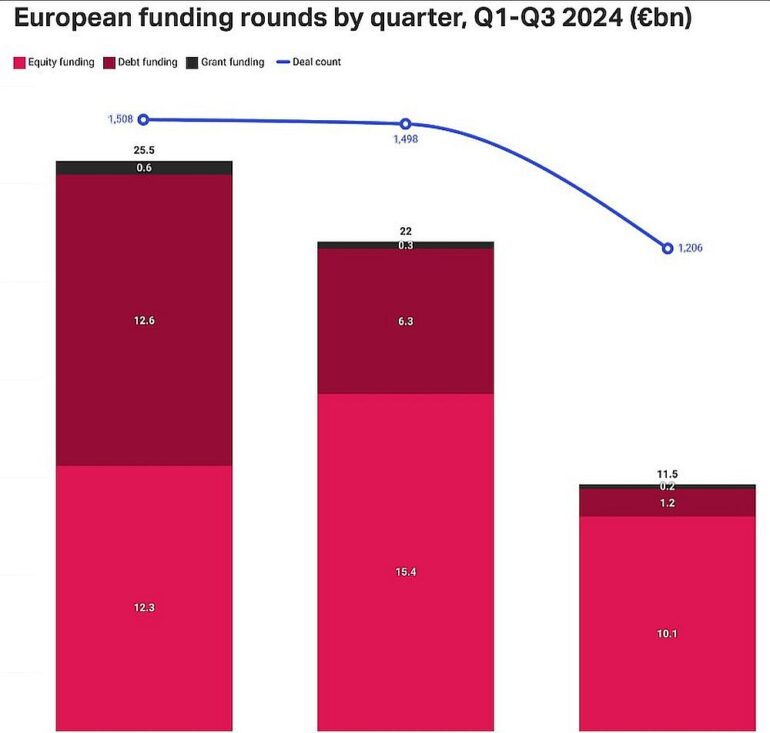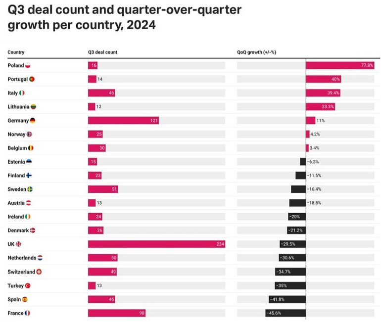 A képet azonban árnyalja, ha dealek számának negyedévenkénti alakulását nézzük: a három nagy ökoszisztémából kettő, az Egyesült Királyság és Franciaország is hatalmas (29,5 és 45,6 százalékpontos) csökkenést könyvelhet el magának átlagosan negyedévente. Velük szemben Lengyelország és Portugália viszont kifejezetten jól teljesített eddig 2024-ben: negyedéves átlagos növekedésük 77,8 és 40 százalékpontos.