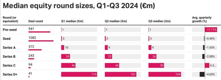 A befektetések mediánértékét tekintve azt látjuk, hogy a legkoraibb, pre-seed szakaszú finanszírozás felé fordult az európai befektetői ökoszisztéma: 11,71 százalékpontos átlagos negyedéves növekedést mutatott a 0 és 5,5 millió euró közötti pre-seed finanszírozási körök nagysága. A másik végletet a késői szakaszú, Series D befektetések adják: ezek esetében 4,6 százalékpontos átlagos negyedéves csökkenést láthatunk. Federico Scolari, a Sifted vezető elemzője szerint a pre-seed és seed körök erős jelenléte hagyományos az európai piacon, amit erősít a mega befektetési körök hiánya.