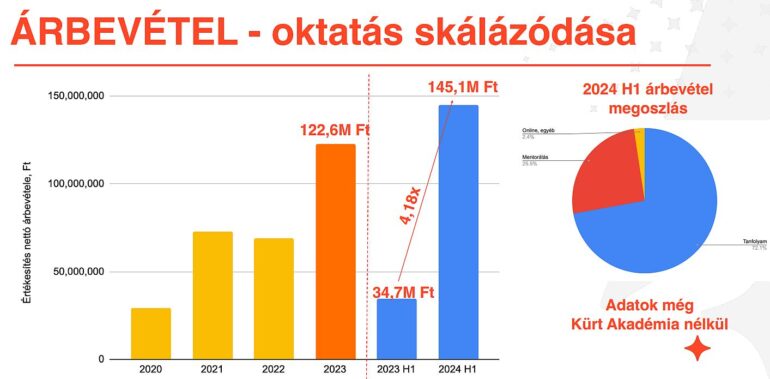 A STRT 2023. első félévhez képest idén első félévre több mint megnégyszerezte az oktatásból származó árbevételét – ez teszi ki egyébként magának a STRT-nak is szinte a teljes árbevételét. Az adatokban még nem szerepel a KÜRT Akadémia mintegy 100 millió forintos árbevétele. A grafikon nem auditált adatokat mutat. Forrás: A háttérbeszélgetésen bemutatott STRT-prezentáció.