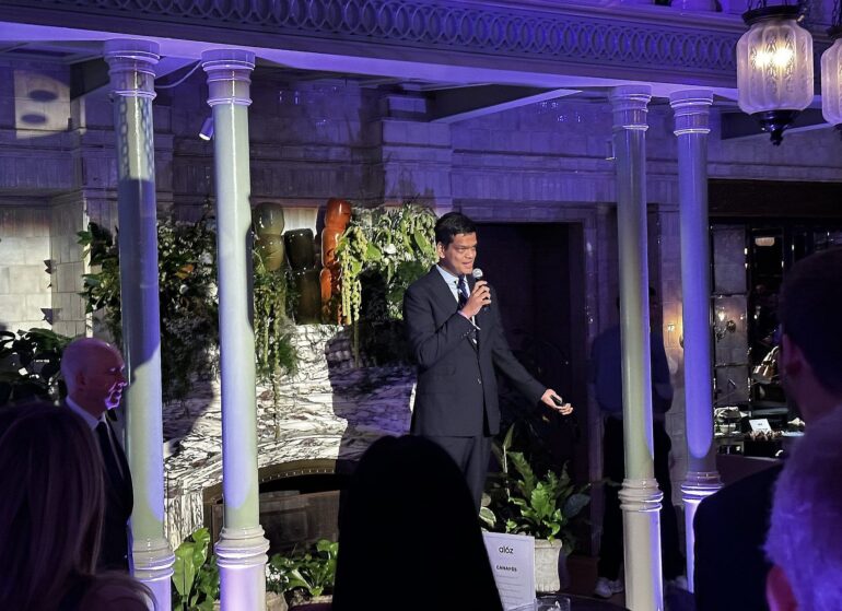 Sriram Krishnan egyébként pont az Andreessen Horowitz most bezárandó, brit irodájának a vezetője volt. A képen az iroda megnyitóján beszél. Forrás: Sriram Krishnan / LinkedIn