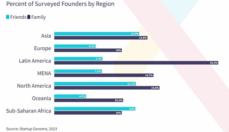A legkiugróbb értéket azonban Latin-Amerikában láthatjuk: az ottani alapítók 24,3 százaléka kapott anyagi támogatást családon belülről, és harmadannyian, 7,1 százalék a barátoktól.