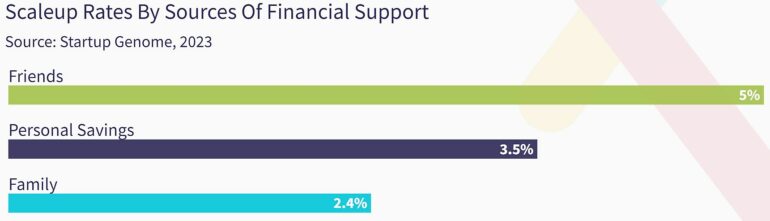 A scaleuppá váló startupok százalékos aránya aszerint, hogy a vállalkozás honnan szerzett a korai szakaszban anyagi támogatást: a barátoktól, az alapító saját megtakarításaiból, vagy a családtól. Forrás: A Startup Genome Scaleup Reportja