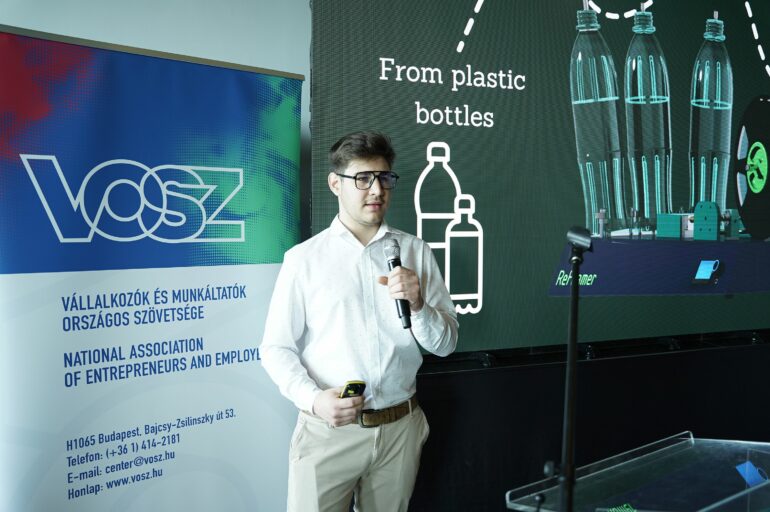 Kiri Hunor, a ReFilamer CEO-ja pitchel a VOSZ Smart startupversenyen. Forrás: VOSZ